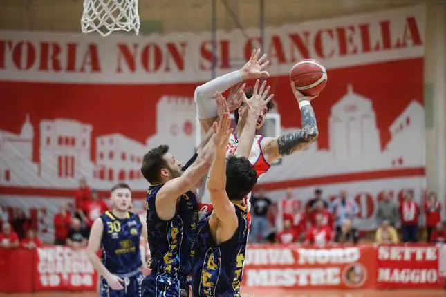 Voltolini su un grande assist di capitan Bottioni arma la mano da 3, ma Contento con una tripla e fallo subito fa esultare la panchina di Mestre al 25’. 66-45.